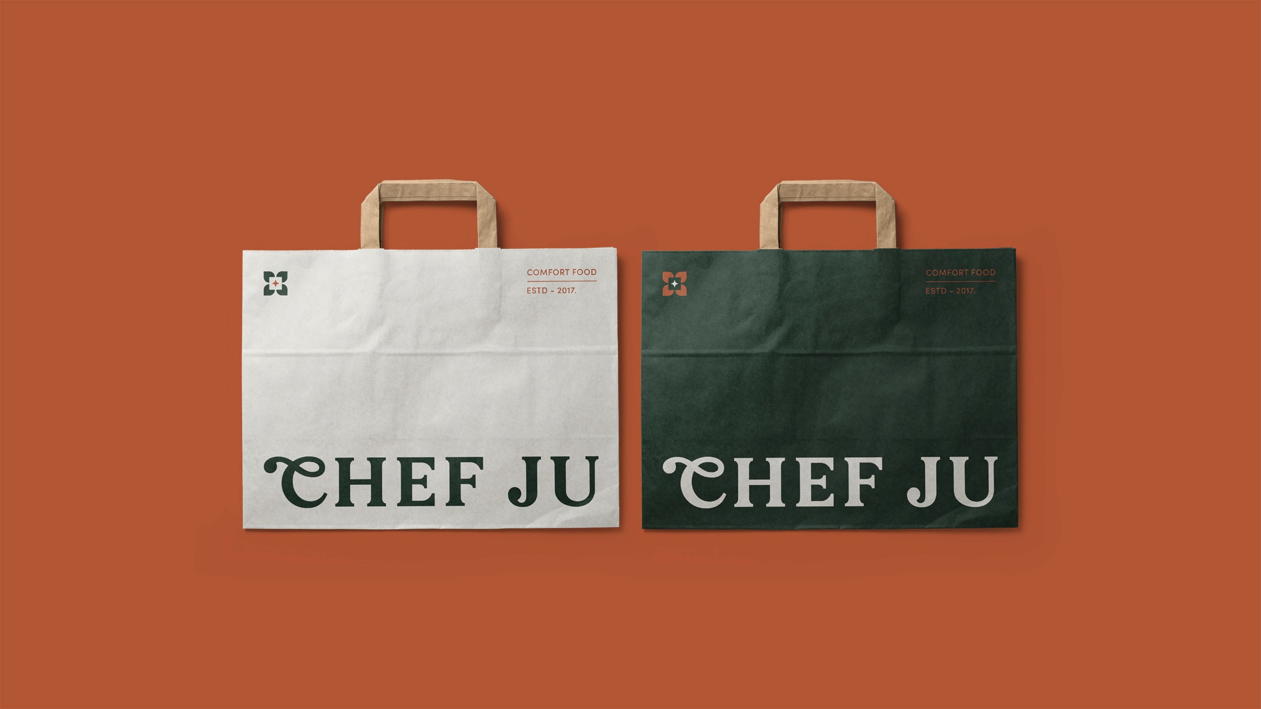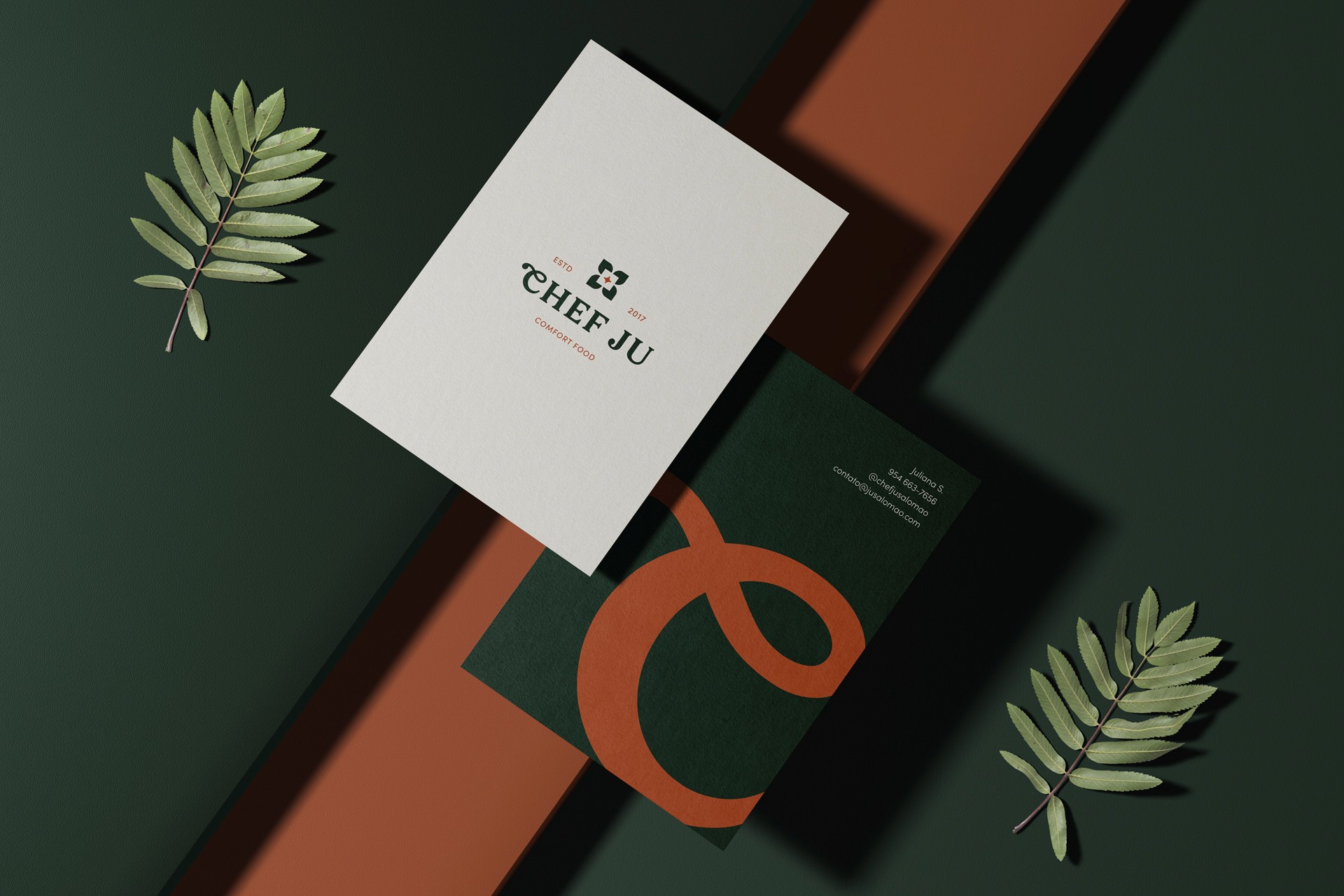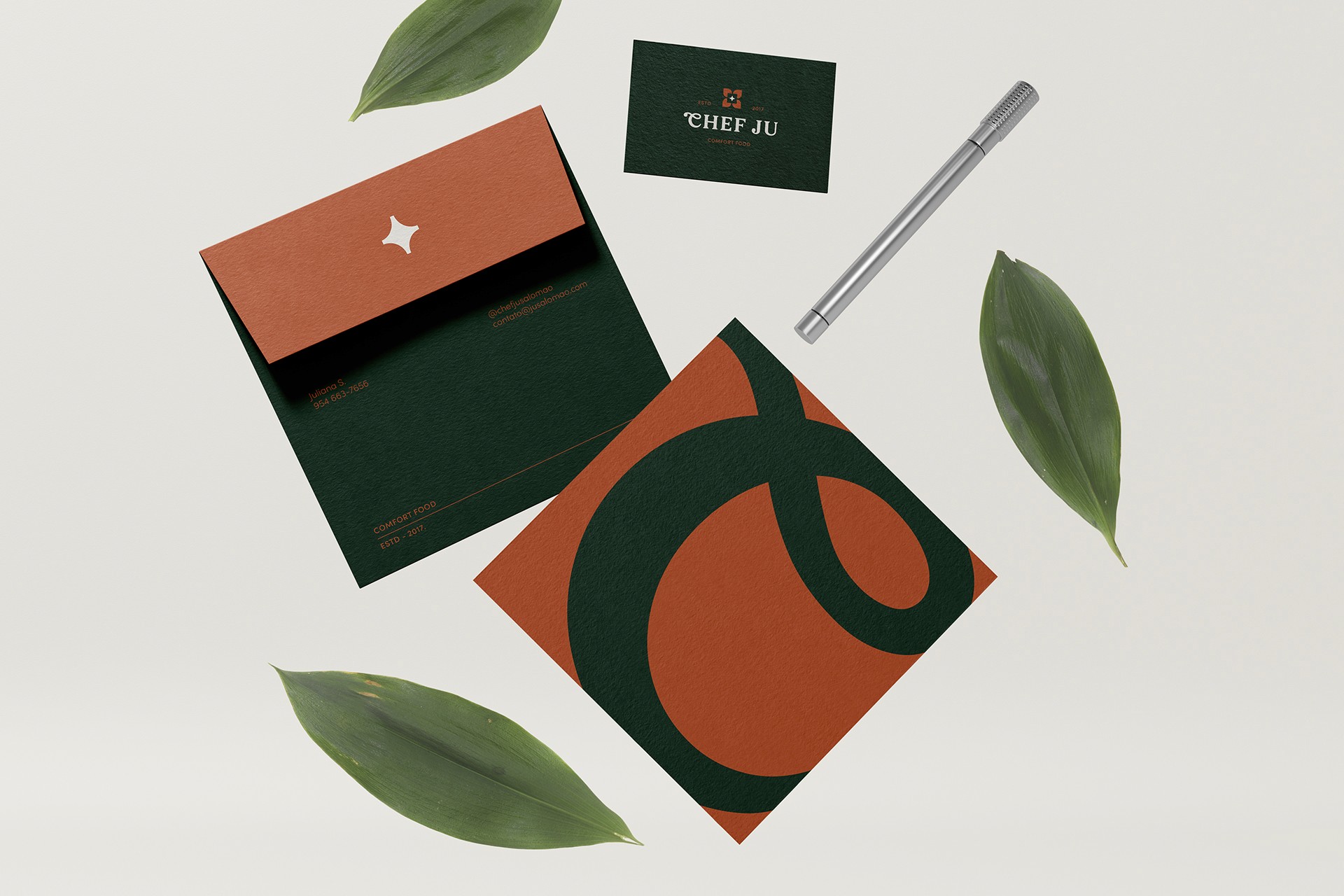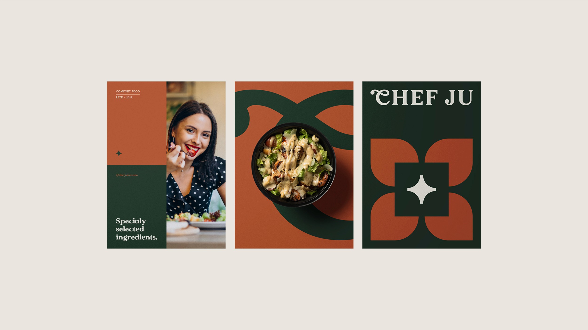 Based on this, a light, modern, and elegant visual identity was created. We can see this in the main typography through the serifs, but also with a glyph with a lot of personality in the letter “C”, which even served as a support graphic. The symbol also had a big impact on the visual identity. Its concept represents leaves, hearts, and light, symbolizing home-cooked and traditional food and all the love the chef has for gastronomy.