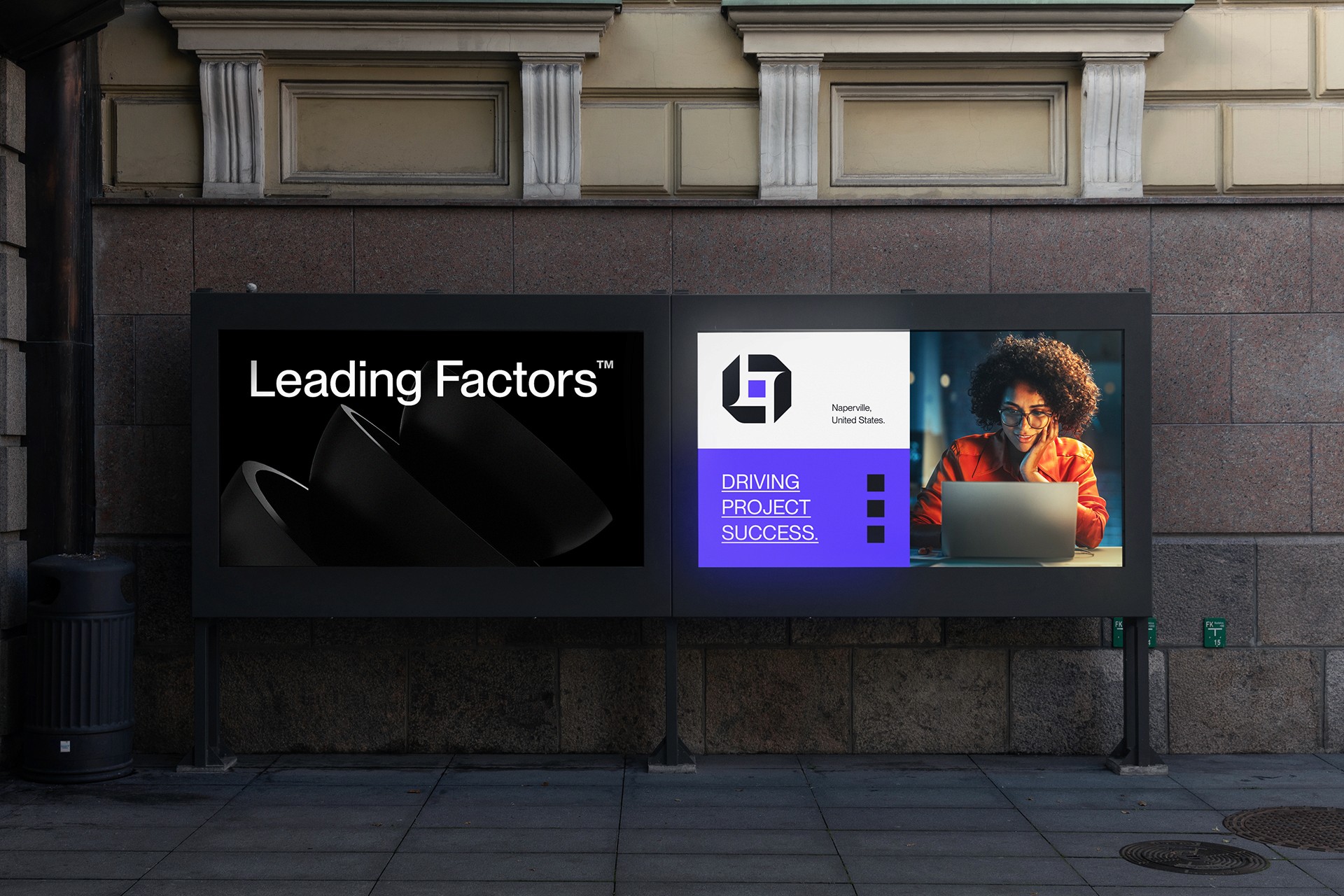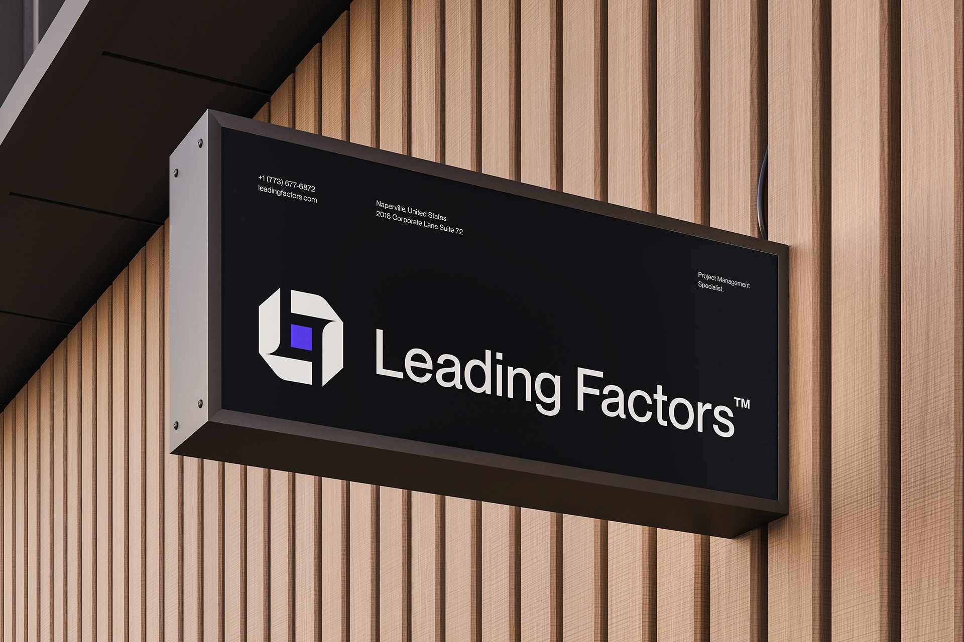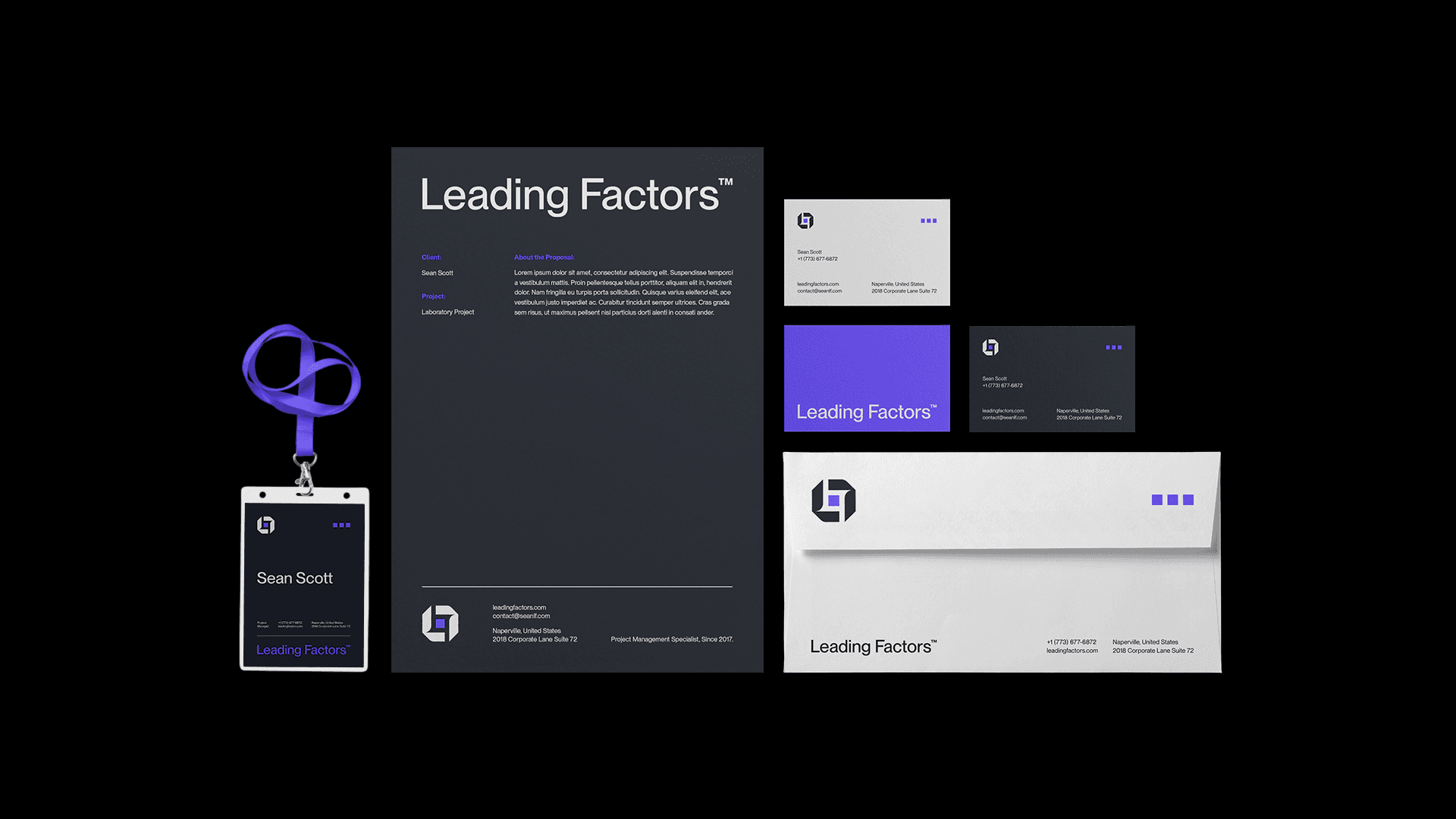 Leading Factors é uma empresa especializada em gestão de projetos de alta qualidade, localizada em Naperville, EUA. A paleta de cores foi escolhida com foco nos seus principais clientes, que são empresas do segmento laboratorial e tecnológico. Os elementos geométricos de apoio em 3D transmitiram ainda mais futurismo e modernidade para a marca, já o símbolo representa a letra L (Leading) e F (Factors), por fim temos o quadrado central que representa o serviço principal da empresa: projeto.